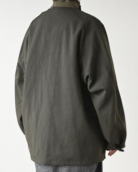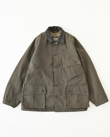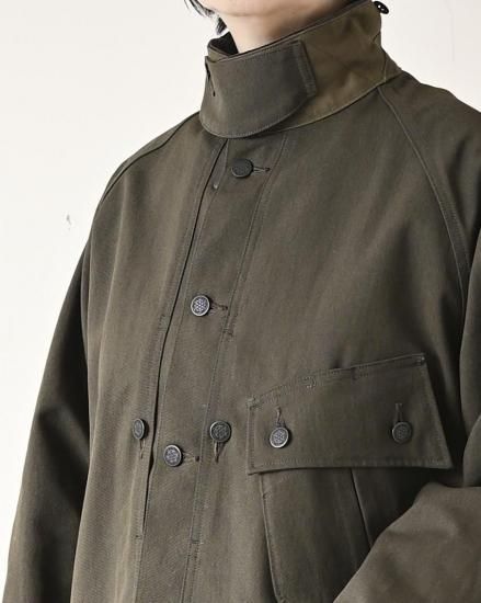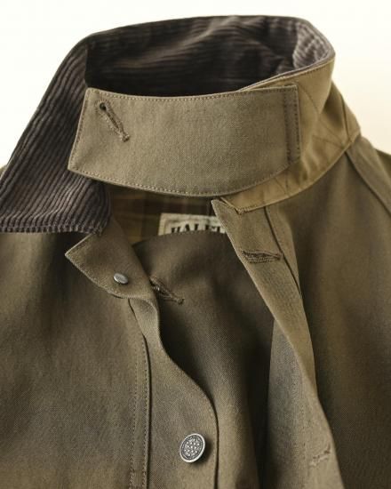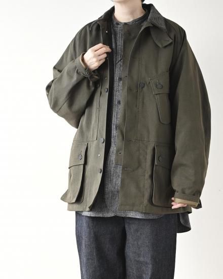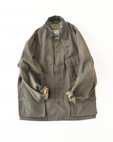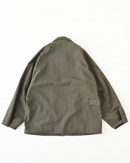襟に配されたコーデュロイ生地、ラグランスリーブ仕様、ガスフラップが配された前立て、大きなフラップが配されたポケットが特徴です。