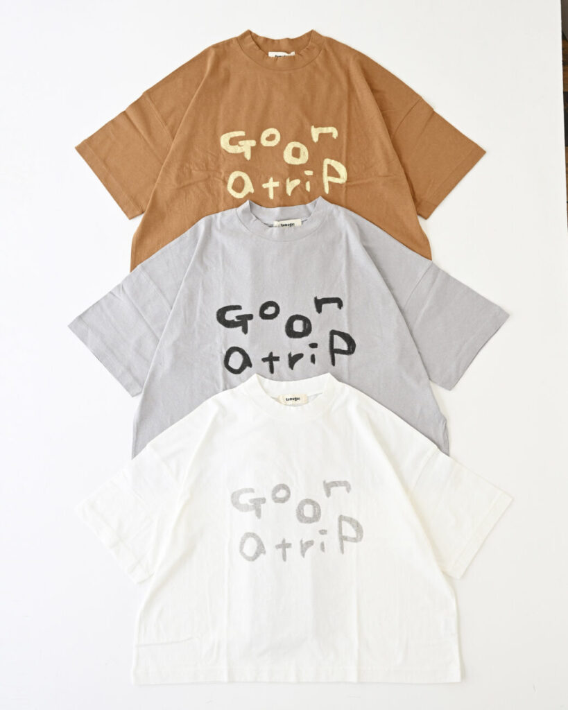 シンプルながらも、手書き風の「go on a trip」のロゴが目を引くプリントTシャツです。